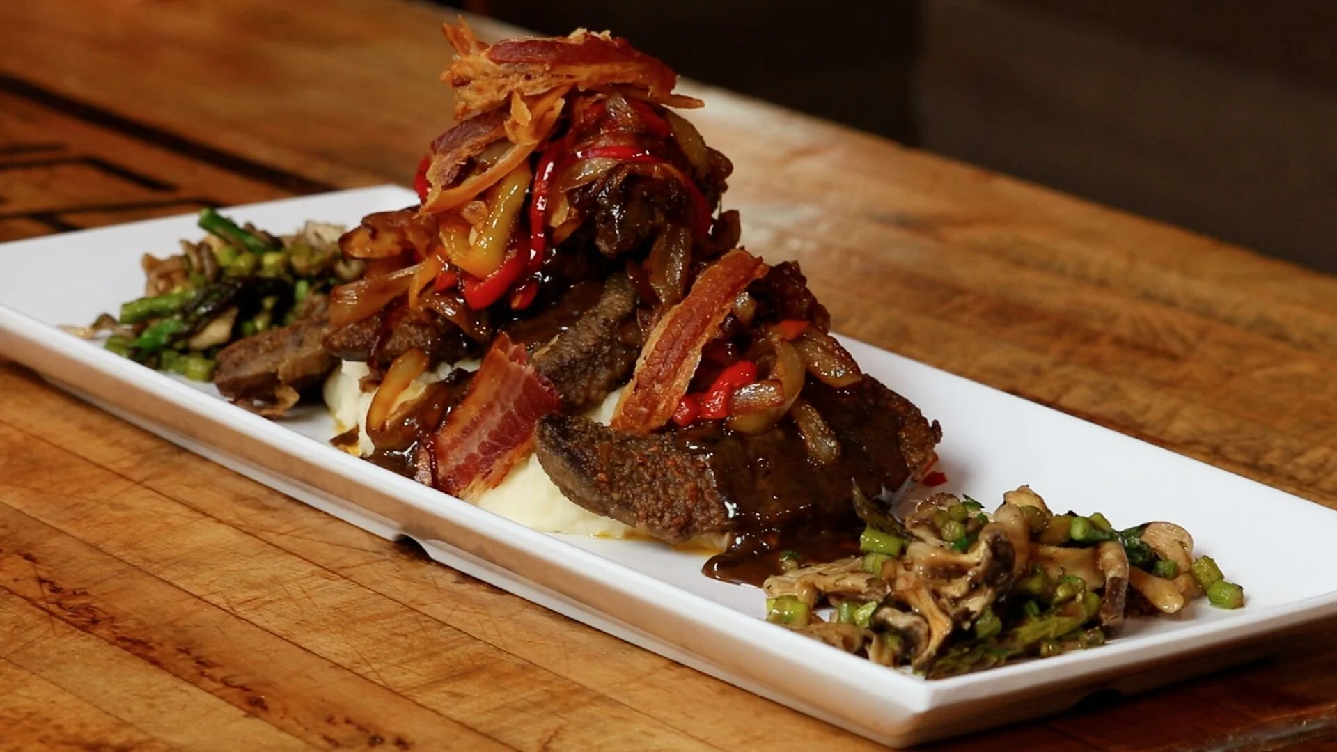 Venison Liver Grilled Onion Walnut Puree Smoked Creminis Red Wine Blueberry Reduction Flavour Pig